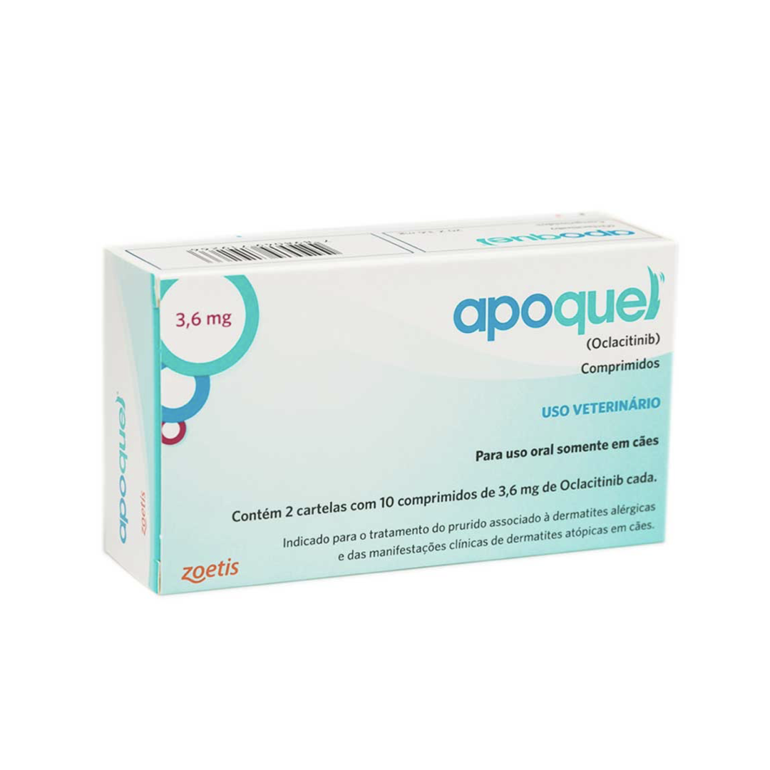 <p>O Apoquel Dermatológico para Cães 20 comprimidos, vai trazer alivio imediato da coceira e tranquilidade para seu animal. É a revolução no tratamento da coceira relacionadas às dermatites alérgicas e dermatite atópica, tem efeito rápido, diminui a coceira em 04 horas. Seguro e eficaz até mesmo nos tratamentos prolongados, e o melhor sem os indesejáveis efeitos da ciclosporina e dos corticosteroides. Esse medicamento melhora a qualidade de vida do pet, assim que iniciam o tratamento os cães passam a dormir melhor e ficam mais relaxados e contentes. O Oclacitinib inibe a atividade de uma variedade de citocinas pruridogênicas e pró-inflamatórias, assim como de citocinas envolvidas em alergias e que dependem da atividade das enzimas JAK1 ou JAK3. Exerce pouco efeito nas citocinas envolvidas na hematopoiese e que são dependentes das enzimas JAK2. O Oclacitinib não é um corticosteroide ou um antistamínico.</p>
