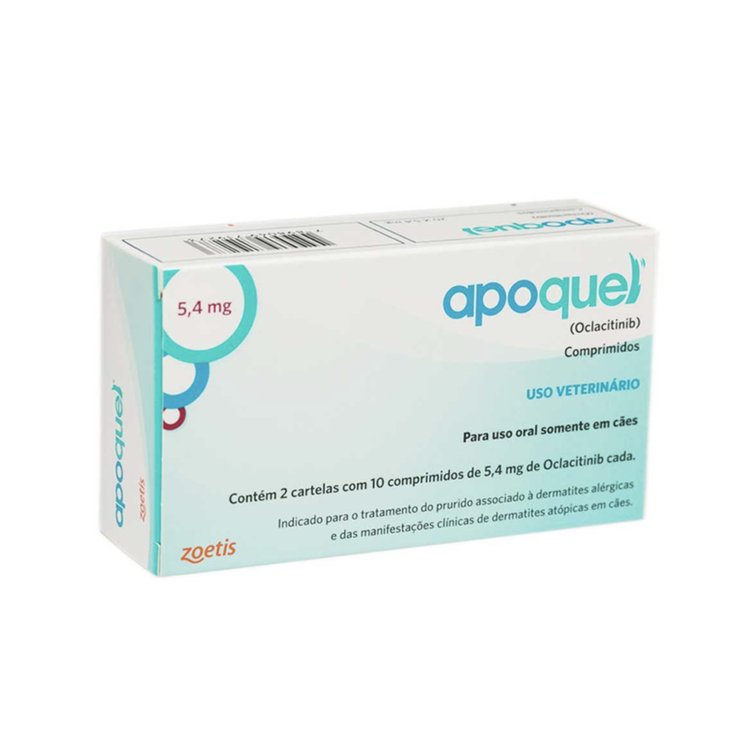 <p>O Apoquel Dermatológico para Cães 20 comprimidos, vai trazer alivio imediato da coceira e tranquilidade para seu animal. É a revolução no tratamento da coceira relacionadas às dermatites alérgicas e dermatite atópica, tem efeito rápido, diminui a coceira em 04 horas. Seguro e eficaz até mesmo nos tratamentos prolongados, e o melhor sem os indesejáveis efeitos da ciclosporina e dos corticosteroides. Esse medicamento melhora a qualidade de vida do pet, assim que iniciam o tratamento os cães passam a dormir melhor e ficam mais relaxados e contentes. O Oclacitinib inibe a atividade de uma variedade de citocinas pruridogênicas e pró-inflamatórias, assim como de citocinas envolvidas em alergias e que dependem da atividade das enzimas JAK1 ou JAK3. Exerce pouco efeito nas citocinas envolvidas na hematopoiese e que são dependentes das enzimas JAK2. O Oclacitinib não é um corticosteroide ou um antistamínico.</p>