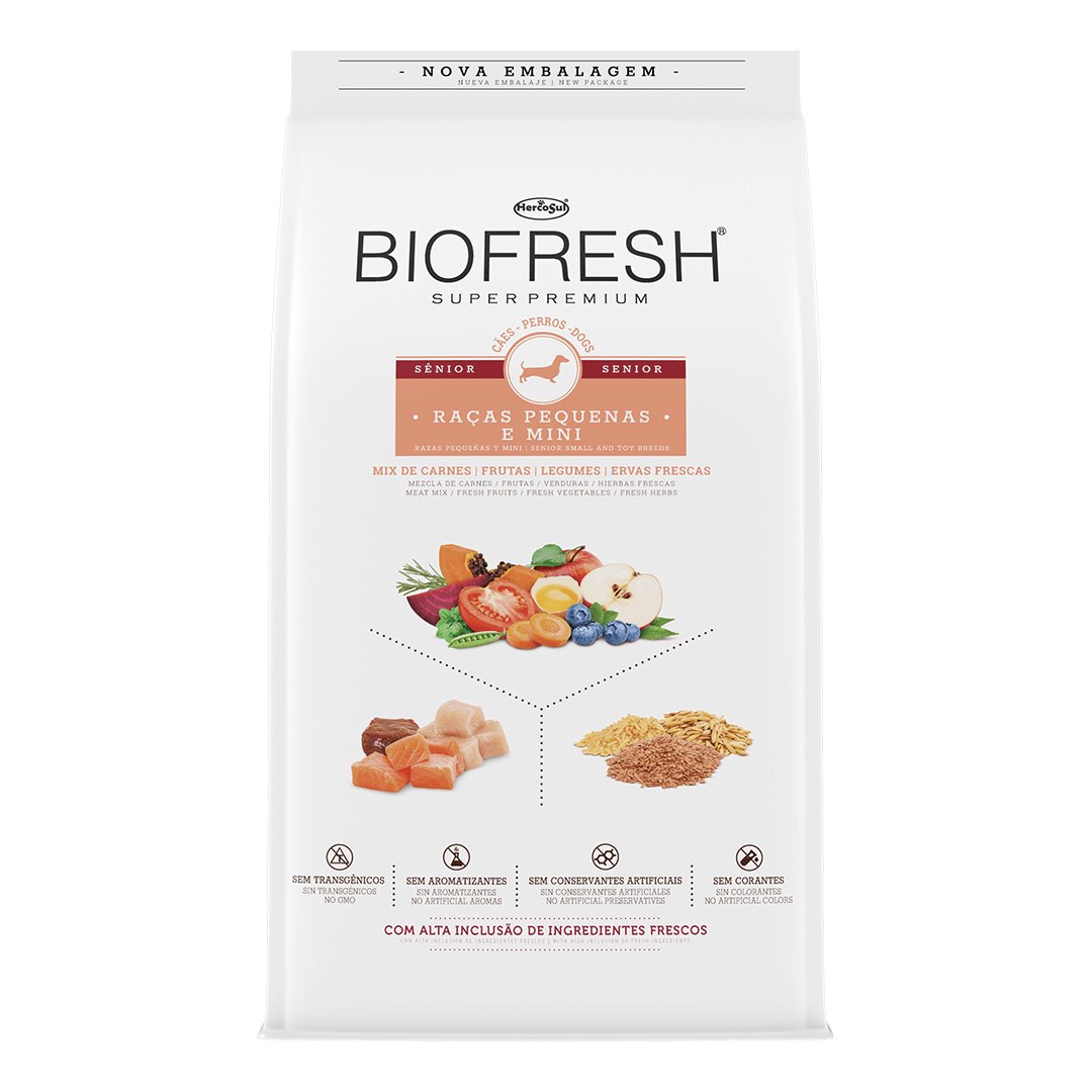 Biofresh Super Premium é inovador e diferente porque possui alta inclusão de ingredientes realmente frescos, diretamente da natureza. O resultado é um alimento completo e equilibrado que se destaca por elevar à nutrição dos cães seniores de raças pequenas e mini ao seu mais alto patamar. Biofresh Super Premium Sênior ajuda a preservar características muito importantes da juventude tais como a musculatura forte, a agilidade mental e a saúde dos sistemas digestivo, renal e cardíaco. A tecnologia Biofresh garante a preservação deste alimento de forma segura e 100% natural, sem adição de conservantes artificiais