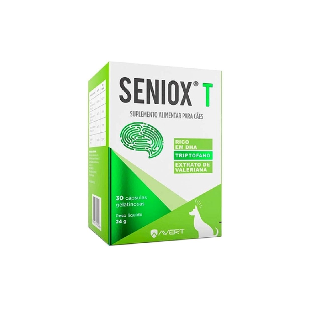 SENIOX T é um suplemento alimentar composto por ácidos graxos essenciais derivados de peixes marinhos (ômega-3), extrato de valeriana e triptofano. É indicado para cães na fase senil que necessitem do aporte nutricional desses nutrientes.